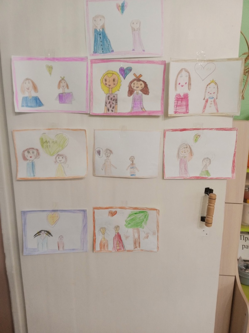 Дети сделали красивые сердечки и подарили их своим любимым мамам, а в творческом уголке нарисовали для мам чудесные букеты цветов. Каждый из ребят с удовольствием принял участие в изготовлении стенгазеты "Мамино солнышко». Каждый ребенок сочинил интересный рассказ про свою маму и поделился им с ребятами из своей группы. Затем нарисовали портреты на тему " Мама и я" и сделали выставку рисунков.